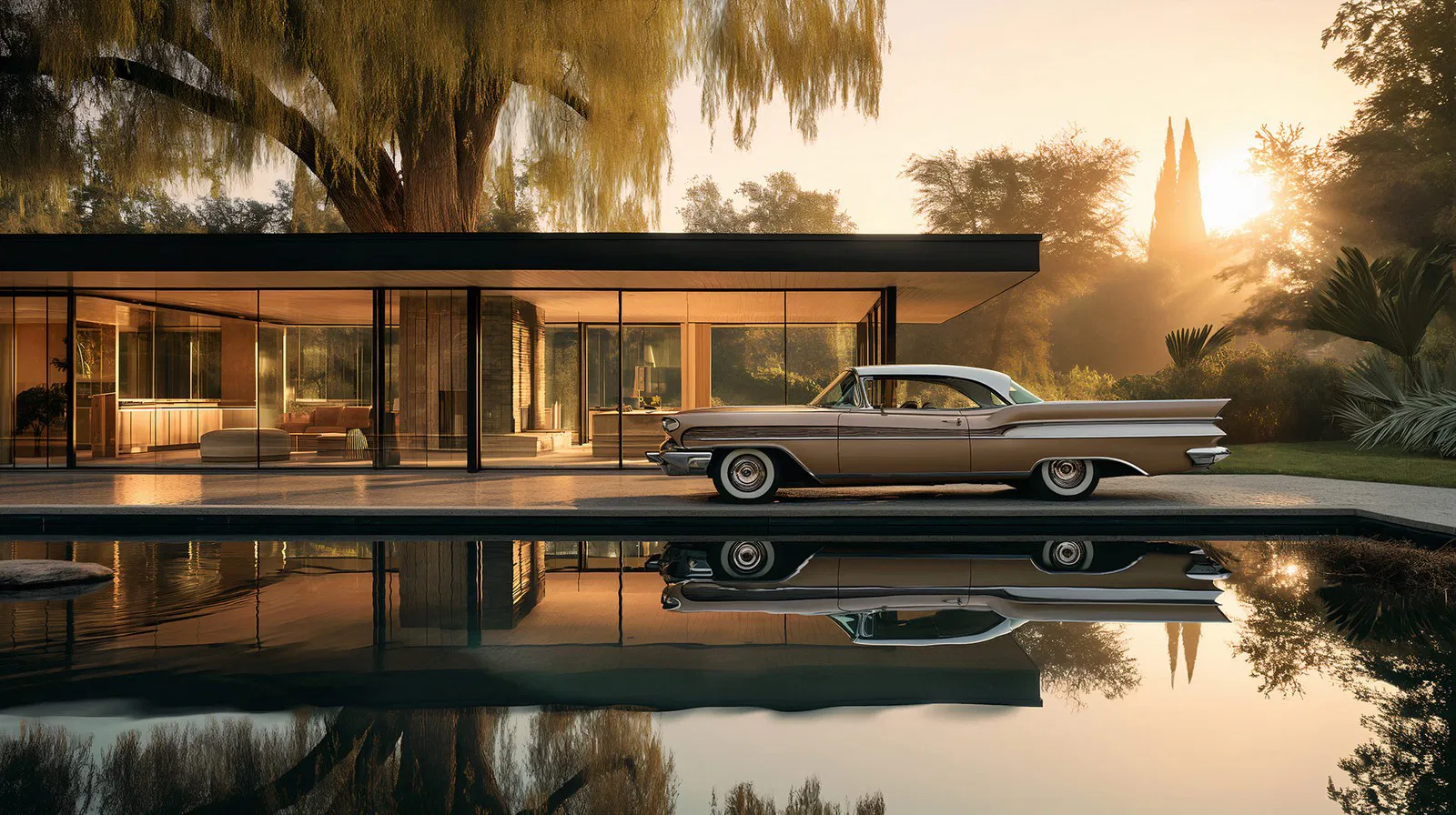 This digital artwork captures the timeless aesthetic of mid-century American leisure. A classic car is parked beside a shimmering turquoise pool, all rendered with a crisp, hyper-realistic clarity that feels both nostalgic and perfectly suspended in time.