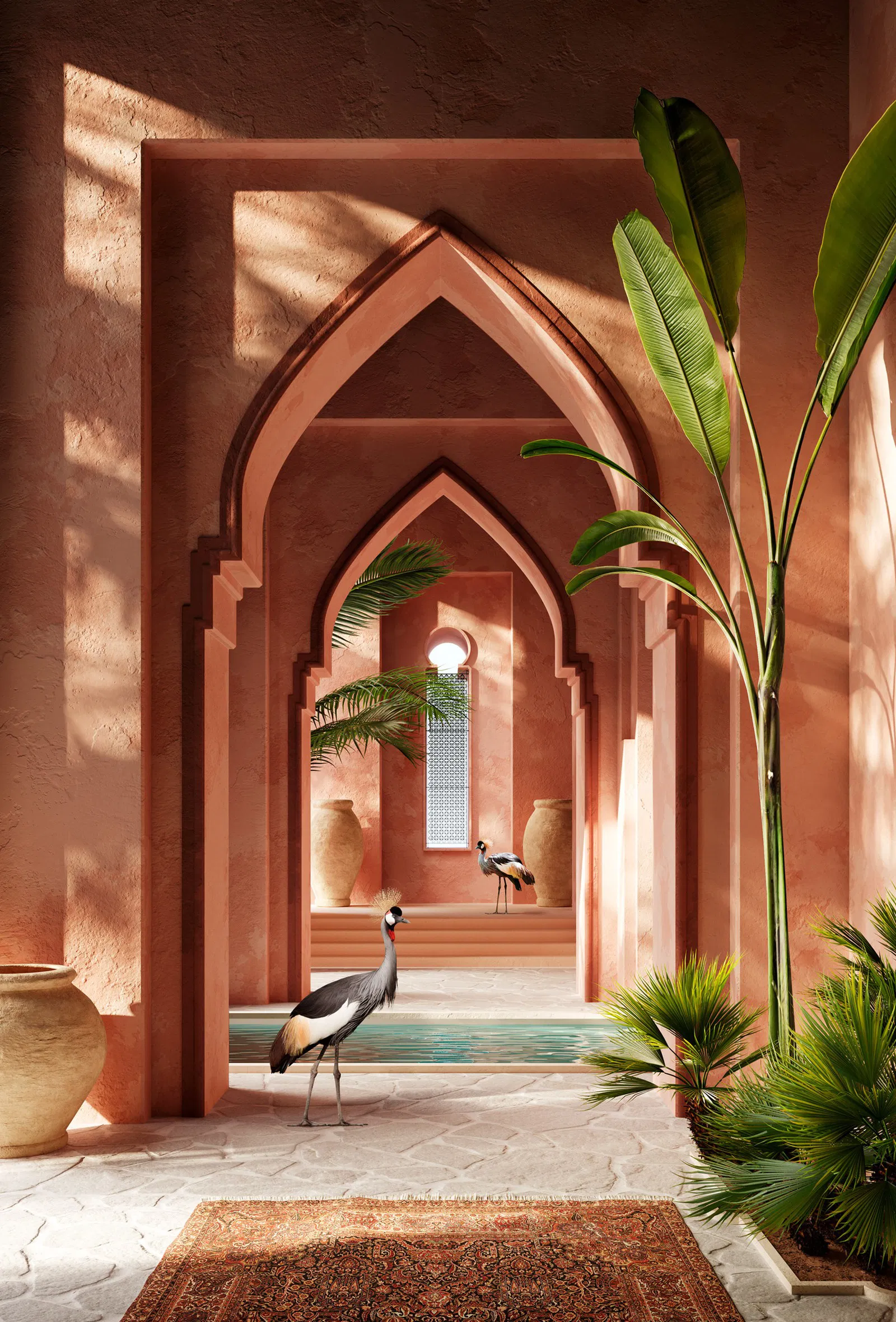 A geometrically perfect rendering of a modernist building, bathed in a surreal, monochromatic pink light. The artist explores the interplay of sharp architectural lines and soft, dreamlike color, creating a nostalgic yet otherworldly sense of place.