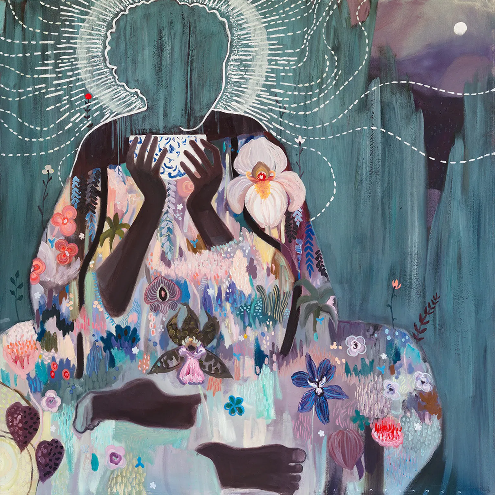 A dark, enigmatic figure stands at the crossroads of seasons, her form a canvas for the transition. The stark, bare branches of winter intertwine with the first vibrant blossoms of spring, all rendered in intricate, Klimt-inspired patterns that shimmer with symbolic life